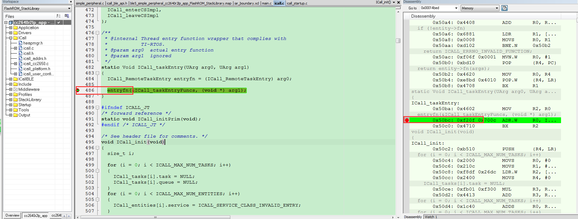 当然如果我们不知道协议栈任务的入口地址,直接通过创建协议栈任务的任务实体入口,直接跳转到ICall_taskEntry->entryfn然后按F11进入协议栈任务调试。